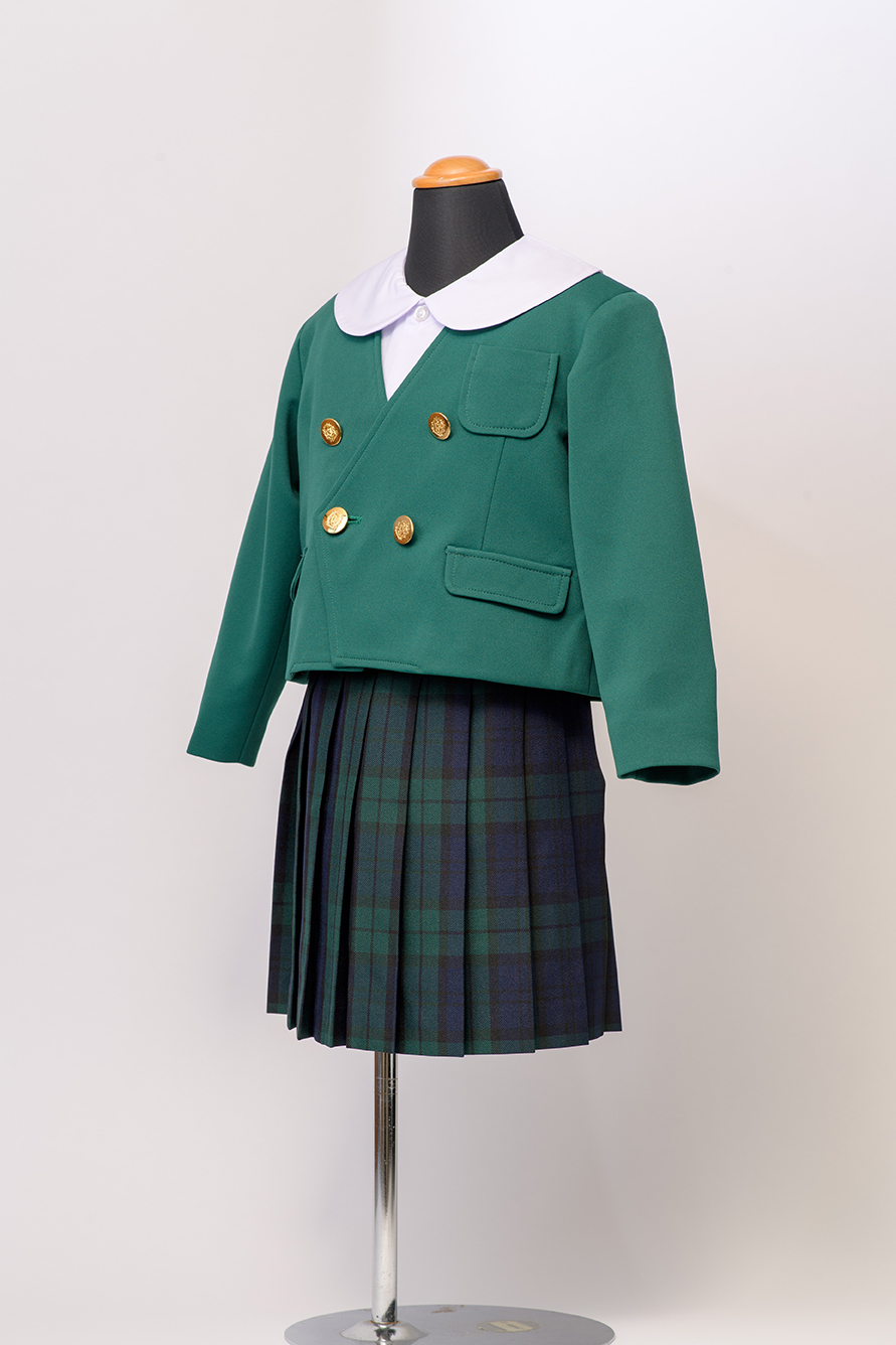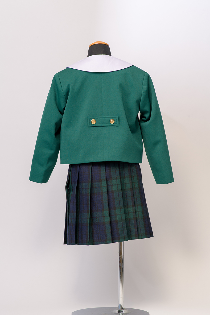 スカートは、グリーンのチェック柄でしっかりとした生地。ポリエステル100%なので、洗濯時の痛みも気になりません。