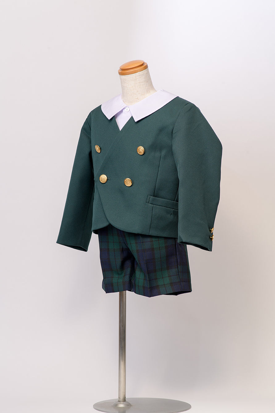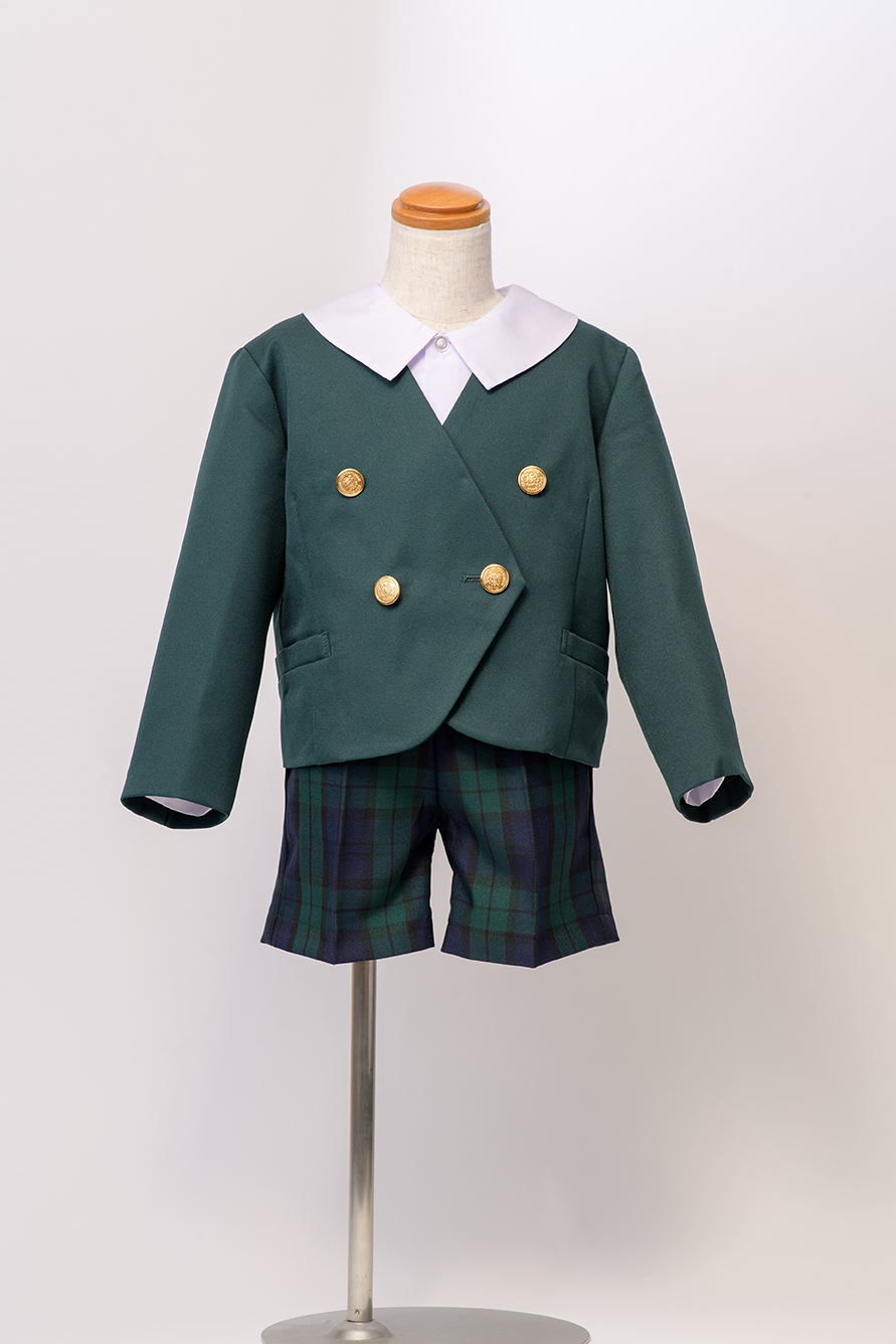 半ズボンは、グリーンチェック柄でしっかりとした生地。ポリエステル100%なので、洗濯時の痛みも気になりません。