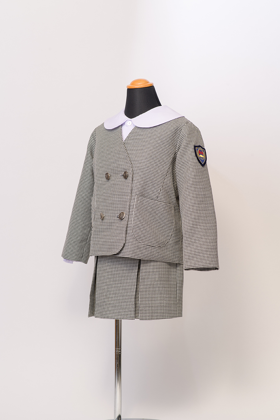 生地色がグレーベースの千鳥格子柄ジャケット、スカート/半ズボンの組み合わせ。さわやかな印象を与える制服セットです。ご要望によりワッペンなどを付けることや、ブラウスなどとの組み合わせをご提案することも可能です。